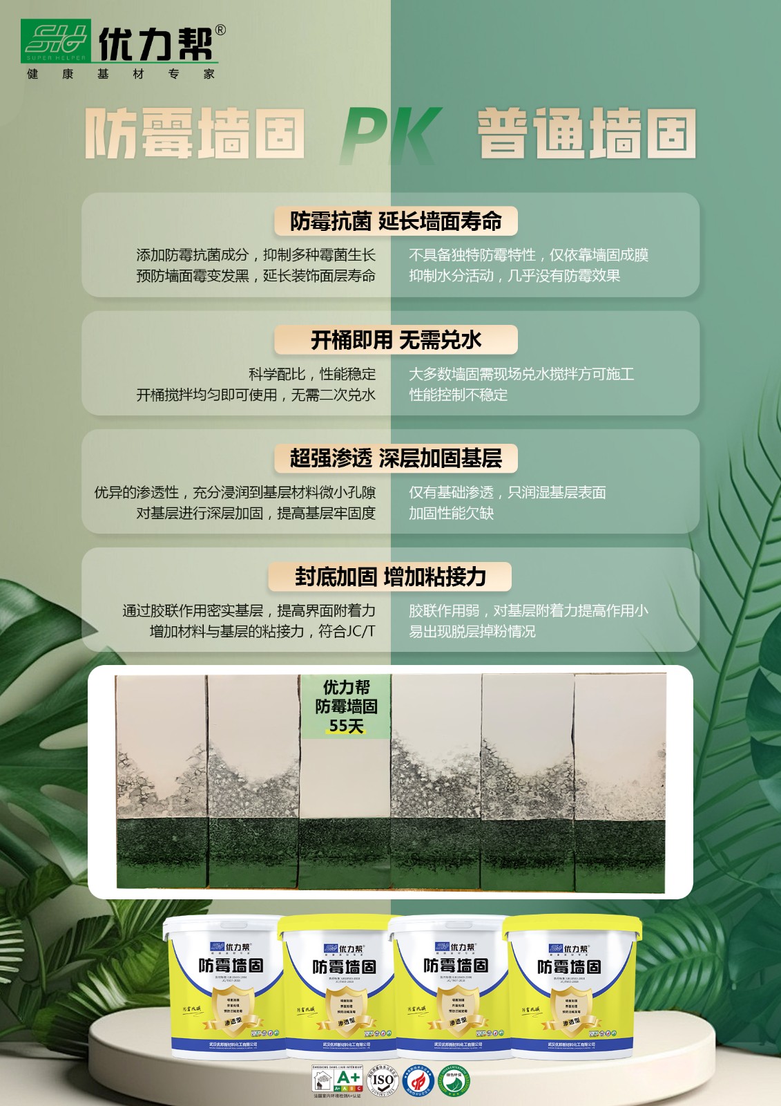 優(yōu)力幫防霉墻固采用先進(jìn)防霉抗堿技術(shù),能有效阻斷水分和堿性物質(zhì)的侵蝕,從根本上抑制霉菌滋生,避免墻面出現(xiàn)霉斑、粉化、脫落等問題,讓您的墻面長久保持潔凈堅固。